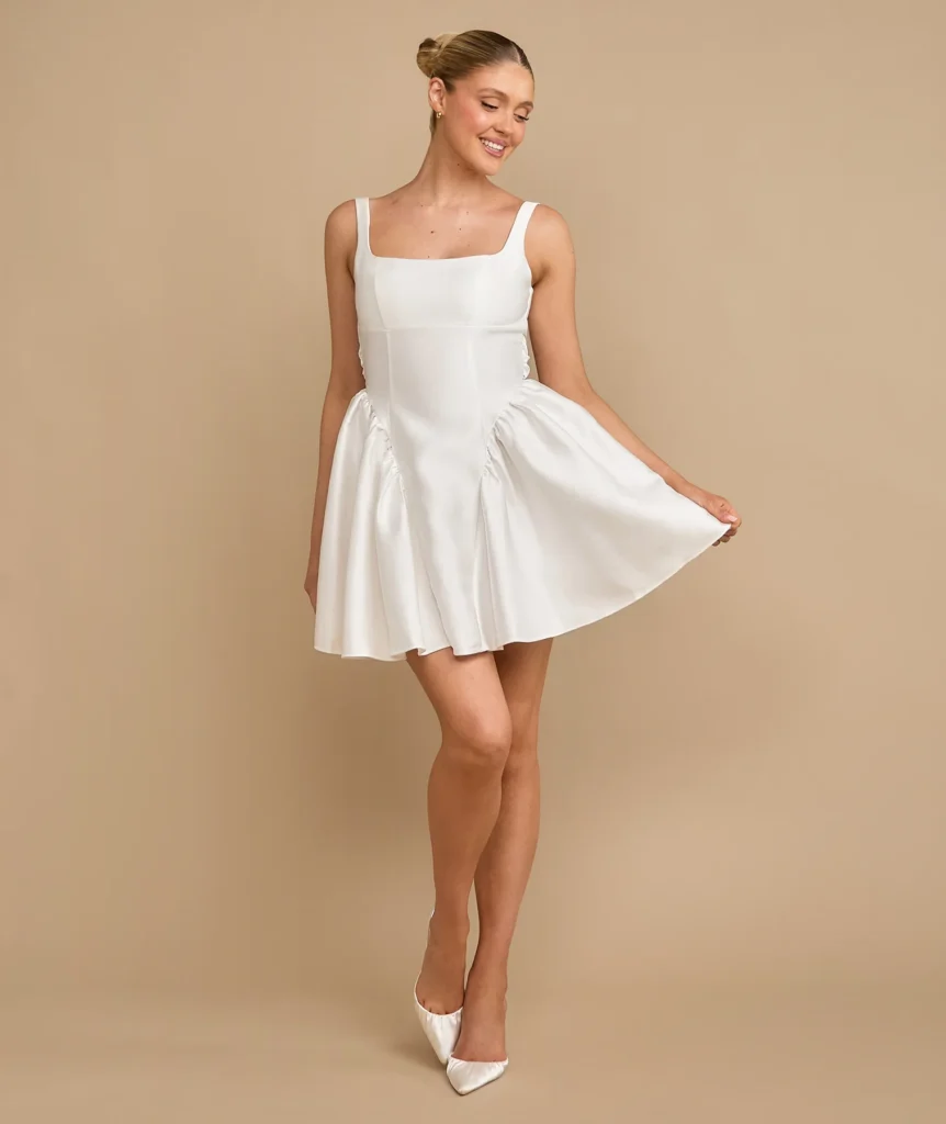 A white satin mini dress with a bow tied across the back feels like pure graduation main character energy.