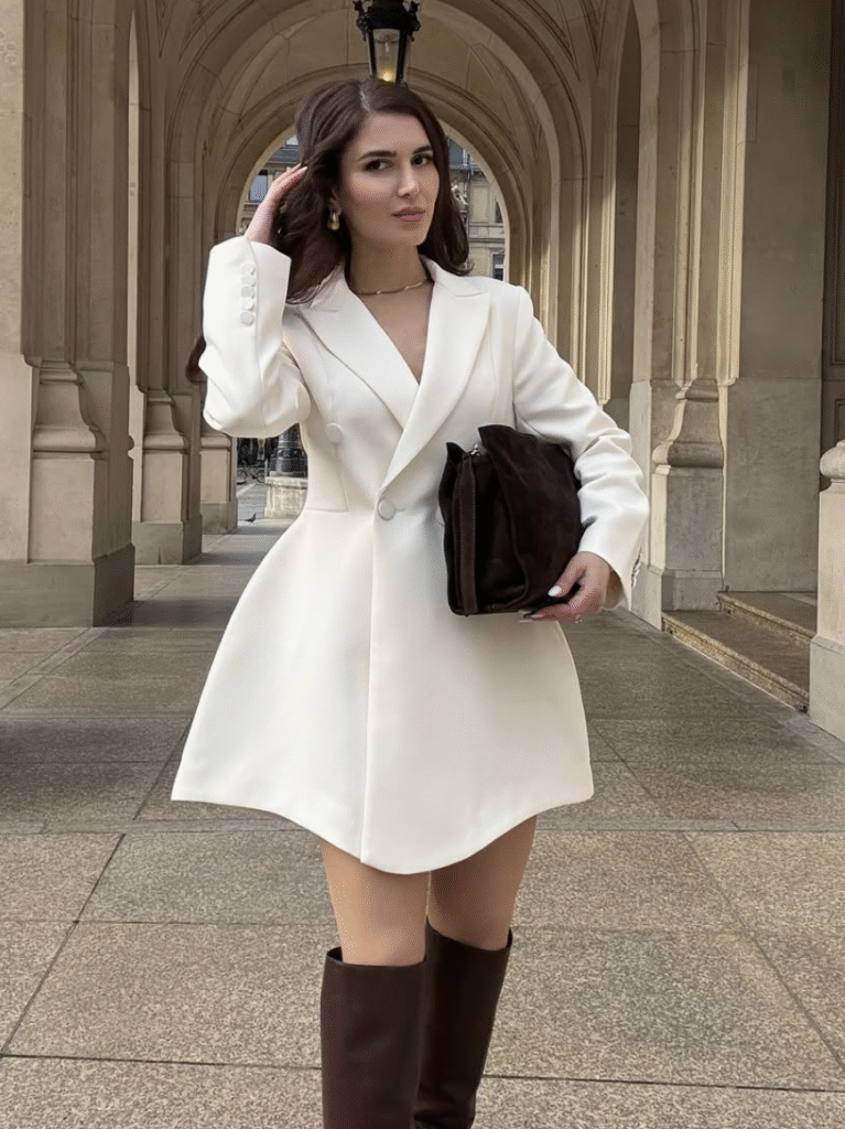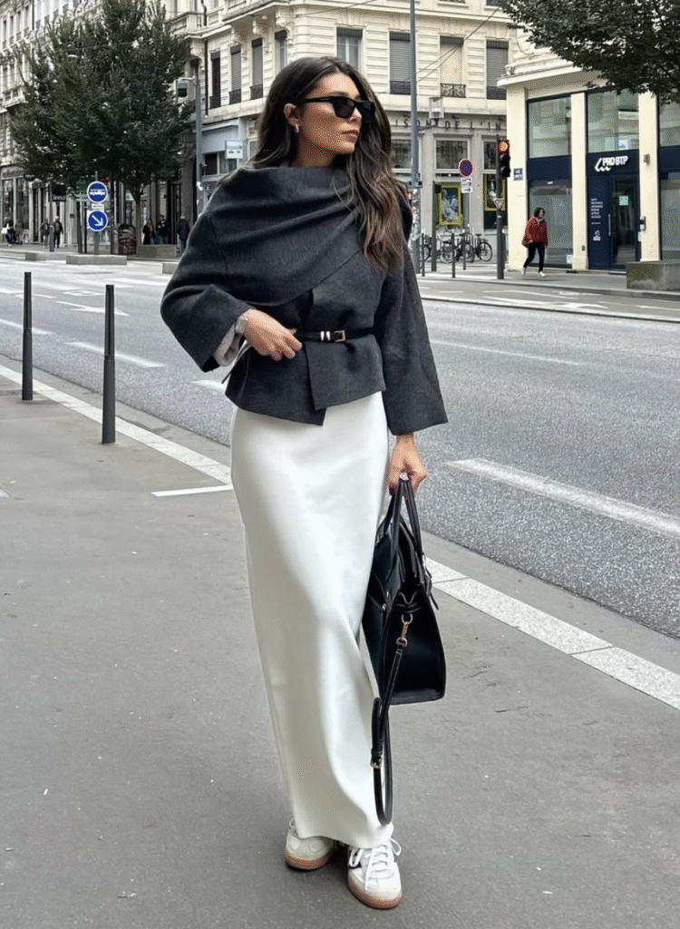 Add sleek hair, minimal gold jewelry, and a structured bag, and suddenly you’re serving classic, confident, and quietly iconic.