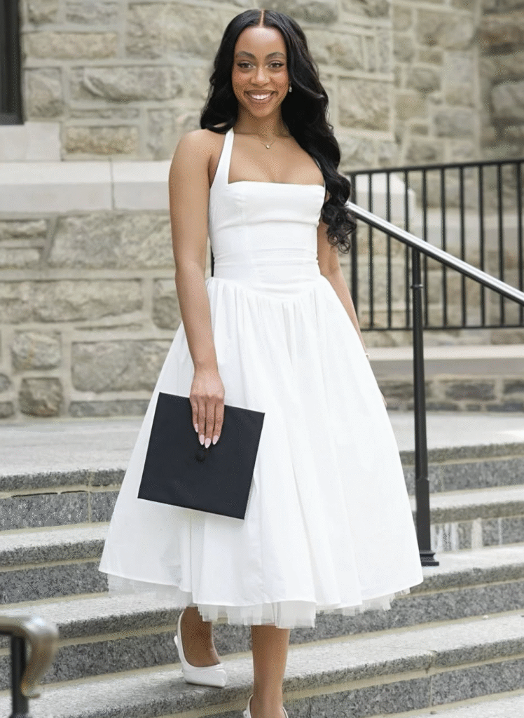 Pair it with simple heels or cute flats, add a little shine, and you’ve got a graduation outfit that feels timeless but still totally you.